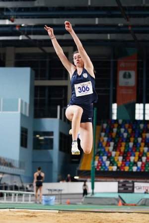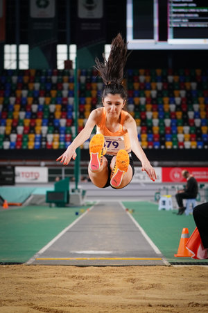 ISTANBUL, TURKIYE - FEBRUARY 22, 2025: Undefined athlete long jumping during Turkish Indoor Athletics Championships in Atakoy Athletics Arena