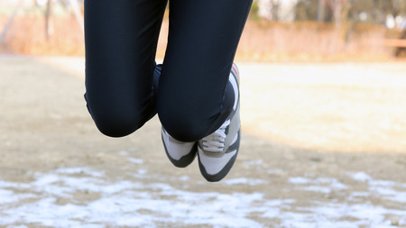 Athlete woman feet with sneakers jumping outdoors