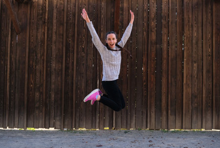 cheerful positive girl jumping in the air with raised hands looking at camera wood background