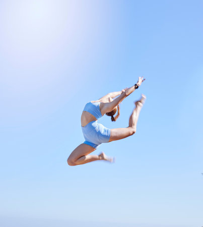 Fitness, jumping and sky with a sports woman mid air outdoor against a clear blue background during summer. Workout, exercise and training with a female athlete leaping for health and wellness