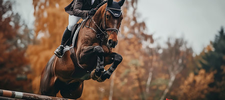 Equestrian rider jumping with text space, showcasing precision and athleticism in horseback sport.