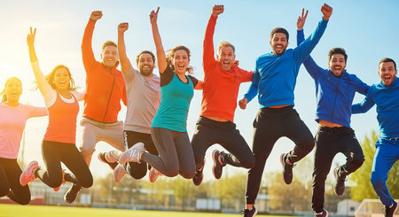 Diverse group of people celebrating joyfulness through energetic movements