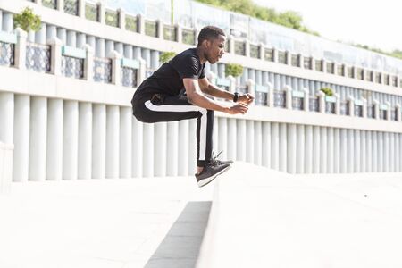 Young man in sportswear jumping in the air on a city street