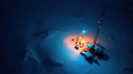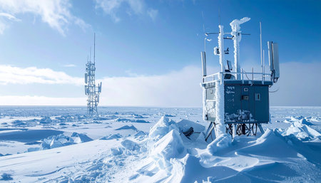 A remote research outpost stands resilient against the extreme polar winter, its communication towers encrusted in thick ice.