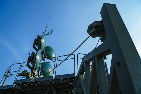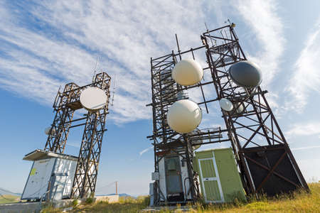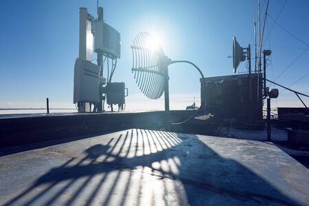 Antenna signal radio high mobile communication network on the background of blue sky.