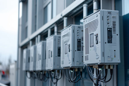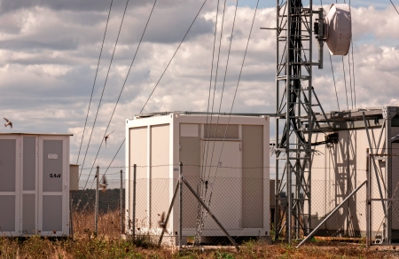 Telecommunication equipment (receivers and transmitters) of mobile network and Internet located on a reinforced concrete wall of a large industrial facility.
