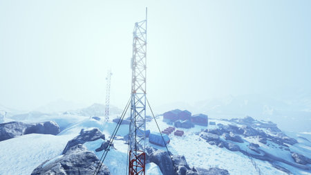 A tall communication tower stands amidst a barren, icy terrain. Bright sunlight reflects off the snow, while small buildings are visible at a distance, creating a stark yet beautiful scene.