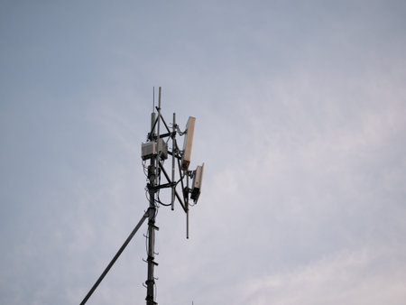 Cellular communication tower with multiple antennas against a clear blue sky, representing modern wireless technology and global connectivity infrastructure.