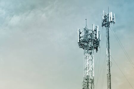 Telecommunication towers of mobile and cellular communication antennas on the background of the sky.