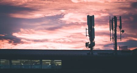 Telecommunication tower with antenna at sunset. Infrastructure of modern communication technology. 5G network connectivity and the global telecommunications industry. Wireless communication industry.
