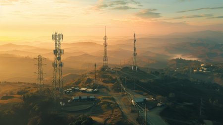 A wide-angle shot of multiple cellphone towers on a mountain range, providing extensive coverage across the area.