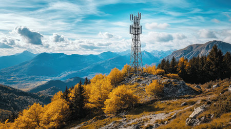A striking telecommunication tower stands tall on a mountain peak, surrounded by vibrant autumn foliage and a stunning blue sky, showcasing nature and technology.