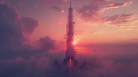 A rocket stands on the launchpad, bathed in the ethereal light of sunrise, with a dramatic cloudscape unfolding in the background.