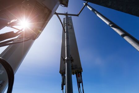 Cellular Base Station or Base Transceiver Station. Telecommunication tower. Wireless Communication Antenna Transmitter. 3G, 4G and 5G Cell Site with blue and cloudy sky.
