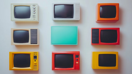 A collection of vintage televisions arranged in a grid, featuring a variety of colors including yellow, red, and mint green. The unique styles highlight retro aesthetics from different eras.