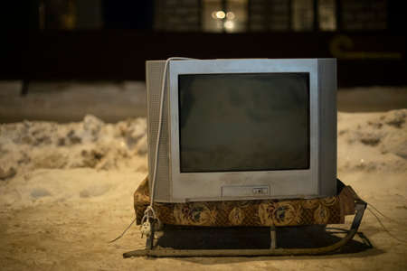 Old TV outside. TV is off. Electronics of the 90s. Transportation of the old thing.