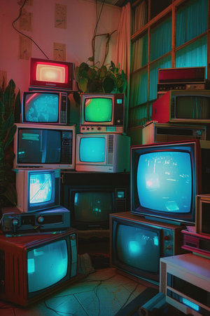 Vintage TV stacks, nostalgic room, colorful screens, retro collection