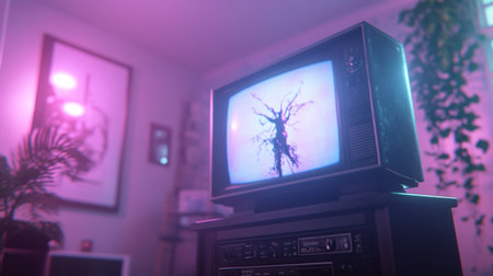 A vintage television set with a CRT screen displays an abstract, glitch-like image, possibly a digital art piece or a distorted signal, under neon lighting.