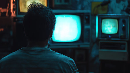 A person is seen from behind, observing several vintage television screens emitting a bright, ethereal glow in a dimly lit environment.