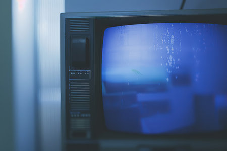 A retro television set emits a captivating blue light, creating a nostalgic atmosphere in a vintage room with tiled walls. Perfect for artistic projects.