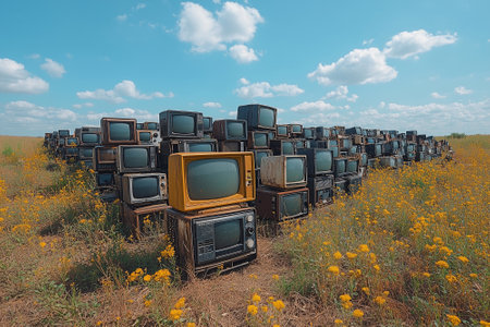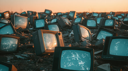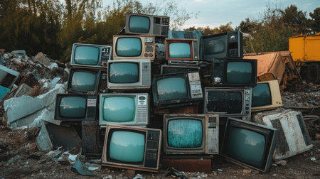 Piles of discarded vintage TVs at a dump, symbolizing technological obsolescence and waste