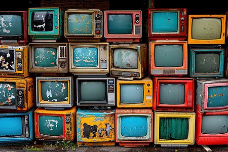 Stacked rows of vintage, colorful TVs with worn-out screens, showcasing a nostalgic collection of retro electronics with chipped paint and weathered appearances.