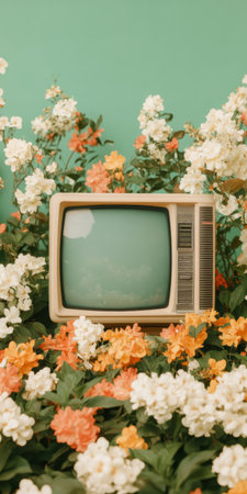 Vintage Television Among Blooming Flowers with Green Background Aesthetic.