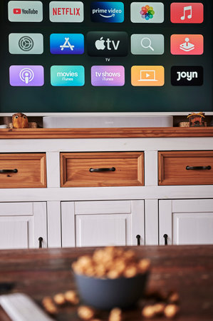 Berlin, Germany - February 5, 2021: Wooden table with snacks, remote control and a TV.
