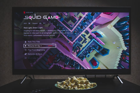 Watching Squid game show on TV. Squid game is a South Korean survival drama television series streaming on Netflix