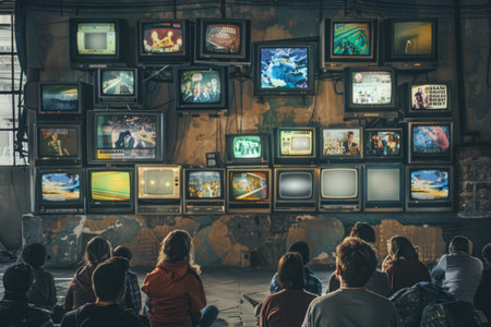 Group of people watching a lot of TV screens. Propaganda and fake news concept. Politicians manipulate society with help of public television