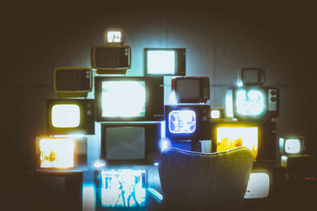 Collection of vintage televisions in room. Retro technology concept. Nostalgia entertainment. Mass media content consumption in the past