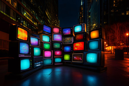 Stack of retro tvs displaying vibrant colors and static noise in an urban night setting