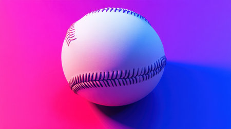 A vibrant baseball displayed on a colorful background featuring neon purple and blue lighting effects. Perfect for capturing the spirit of sports and recreation.