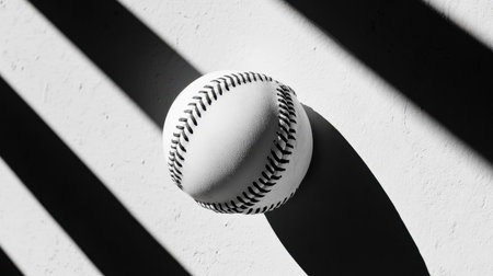 A striking black and white composition featuring a baseball casting dramatic shadows on a textured surface, evoking a sense of sports culture and artistry.