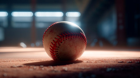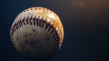 A close-up image of a worn baseball, showcasing its intricate stitching and weathered texture. The shot is illuminated dramatically against a dark background, highlighting the ball's character and charm within the sport of baseball.