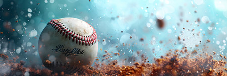 Baseball in motion on field during a sports game. Panorama with copy space..