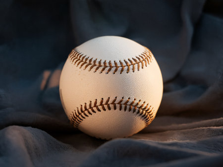 A close-up view of a baseball resting on soft fabric, illuminated by gentle shadows. The image captures the serene essence of the sport, showcasing details of the ball