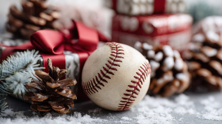 A charming winter scene featuring a baseball, Christmas gifts, and pinecones, evoking a cozy and festive atmosphere perfect for seasonal celebrations.