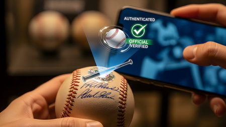 Hand holds signed baseball scanned by smartphone displaying hologram authentication. Clear detail...