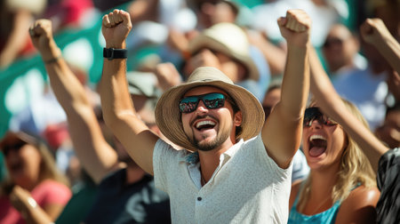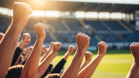 Passionate sports fans celebrating victory with raised fists and cheering in stadium crowd, wearing team colors under golden sunlight.