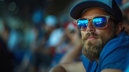 Portrait of a bearded man with sunglasses and cap enjoying a lively football tailgate event.