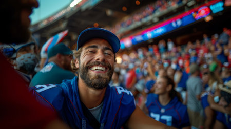Happy American football supporter enjoying a tailgate event in a lively stadium filled with cheering fans.