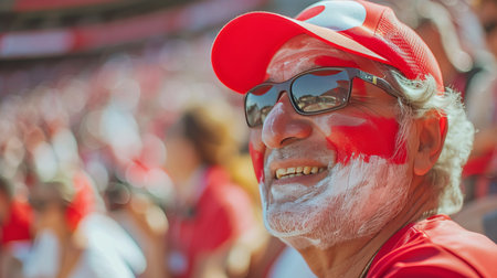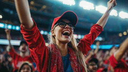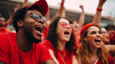 Enthusiastic fans in red clothing are cheering loudly at a sporting event, capturing the energy and excitement of the crowd in a lively and engaging atmosphere, AI generated