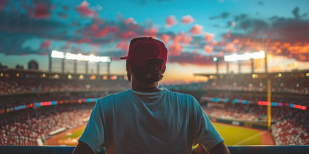A vibrant baseball stadium is filled with enthusiastic fans as the sun sets in the background, illuminating the field and creating a lively atmosphere for the game.