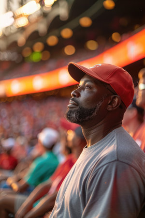 A man wearing an orange hat is seated in the audience of a stadium, perhaps enjoying a sports event