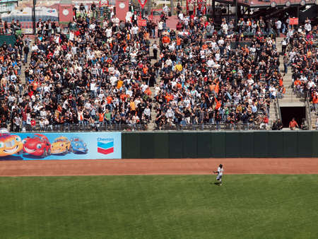 San Francisco Giants vs. Pirates: Pirates Lasting Milledge chases after a homerun ball, taken at At&T Park San Francisco California on April 14, 2010.