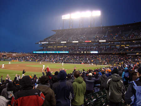 SAN FRANCISCO - APRIL 11: Braves Vs. Giants: Giants fans raise hands in air to celebrate strikeout win after a wet day of baseball taken April 11 2010 at Att Park San Francisco California.