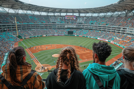 The assembled fans follow the baseball game with enthusiasm, feeling pride and joy, creating the atmosphere of a sports festival.