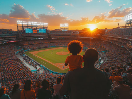 Parent and child at baseball stadium during sunset, shared family moments in a sports setting, bonding and relaxation outdoors.