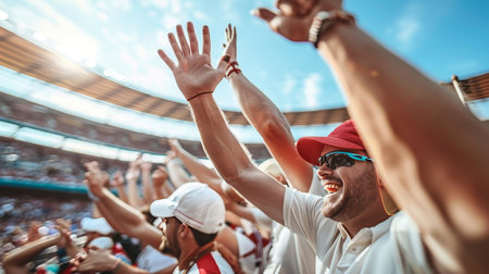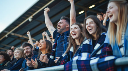 A group of enthusiastic fans celebrating at a sports event, showcasing their team spirit. The atmosphere is vibrant and filled with energy as supporters cheer and wave their hands. ai generated.